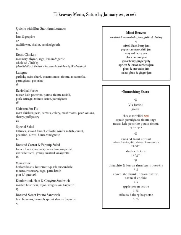 New soup this week is Minestra di funghi e riso, mixed mushrooms and rices swimming in a vegetable base - earthy, sweet and all together comforting. Drizzle with lots of olive oil and some grated parmigiano and swoop in with a piece of baguette for a satisfying bowl for lunch or a light supper. Chicken Pot Pie weather is here. Ours is loaded with tender chicken and vegetable in a sauce enriched with a little cream and sherry, topped with flaky puff pastry. A beautiful winter salad of sweet roasted carrots and parsnips pair beautifully with french lentils, salty and savory french rouquefort with toasted walnuts and cornichon over mixed lettuces all pulled together with a grainy mustard vinaigrette. Kinderhook Farm ham is delicious and even better when paired with roasted bosc pears, nutty gruyère and arugula on baguette. The vegetable sandwich is colorful, creamy and crunchy. Shocking beet hummus is topped with roasted sweet potatoes and a zippy brussels sprout slaw on baguette. Lasagne, Ravioli al forno, Roast Chicken makes for an easy meal, just add salad and dinner is sorted.