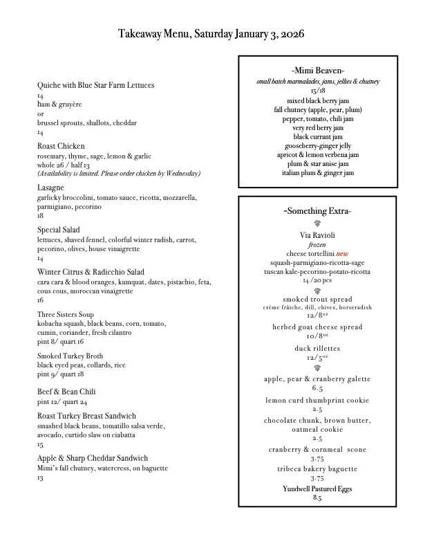 Don’t forget Mimi’s jams, fantastic frozen Tortellini and Ravioli from Via Ravioli, Tribeca Bakery Bagette, and our own Duck Rillettes. Biscuits and Frittata are available by special order, mention to Michael when you call. And don’t forget to check out the sweets department!