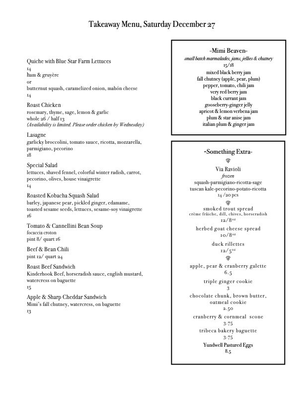 Chicken Pot Pie weather is here for a while. Ours is loaded with tender chicken and vegetable in a sauce enriched with a little cream and sherry, topped with flaky puff pastry. A beautiful winter salad of sweet roasted carrots and parsnips pair beautifully with french lentils, salty and savory french rouquefort with toasted walnuts and cornichon over mixed lettuces all pulled together with a grainy mustard vinaigrette. Kinderhook Farm ham is delicious and even better when paired with roasted bosc pears, nutty gruyère and arugula on baguette. The vegetable sandwich is colorful, creamy and crunchy. Shocking beet hummus is topped with roasted sweet potatoes and a zippy brussels sprout slaw on baguette. Lasagne, Ravioli al forno, Roast Chicken makes for an easy meal, just add salad and dinner is sorted.