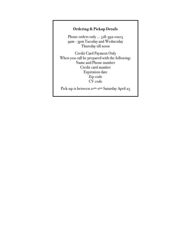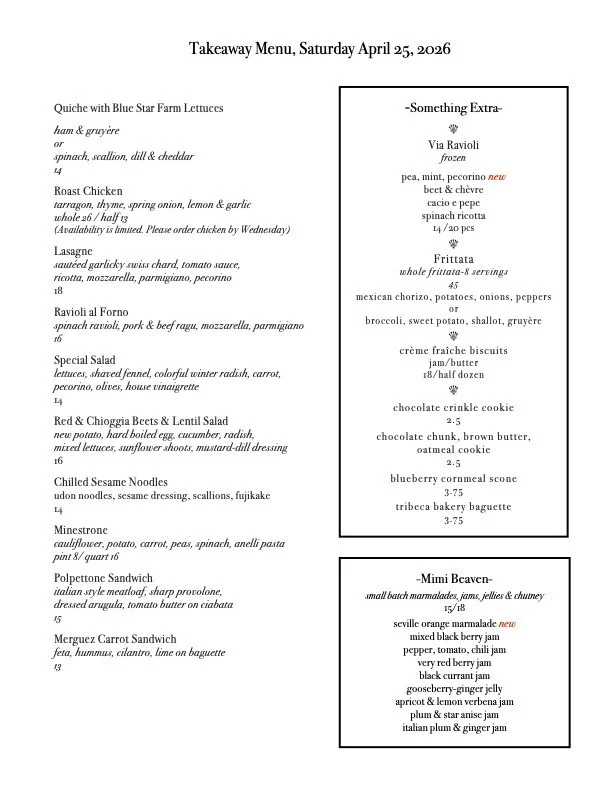 Spring spinach from Blue Star Farm joins, scallions, fresh dill and cheddar for our vegetable quiche. Roast Chicken welcomes spring stuffed with fresh tarragon, thyme, spring onions, lemon and garlic. We have two soups this week. Cauliflower soup is a purèe and topped with a swirl of bright pea shoot pesto. Northwind Farms chicken kielbasa with butter beans and kale is a delicious meal in a bowl. The “other salad” this week is lentil, with new potatoes, red and chioggia beets, hard boiled egg, cucumber and radish over mixed lettuces with mustard dill dressing. We are roasting pork tenderloin in the style of Chinese Char Siu/bbq pork for a sandwich on baguette, with sesame-soy cabbage slaw and spicy mayo. And our old favorite, merguez carrots with hummus, feta and cilantro on baguette returns.