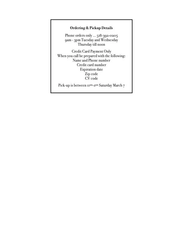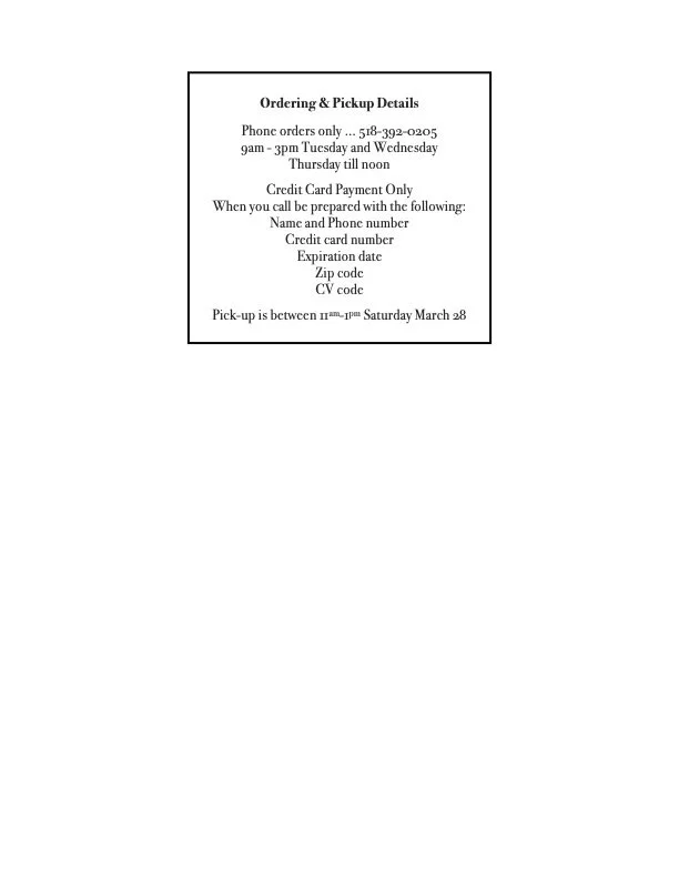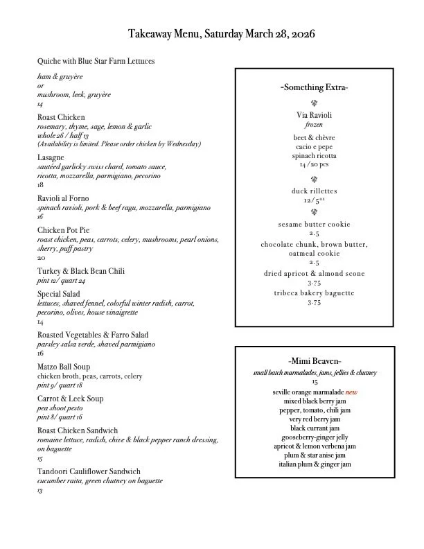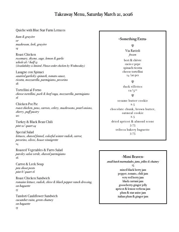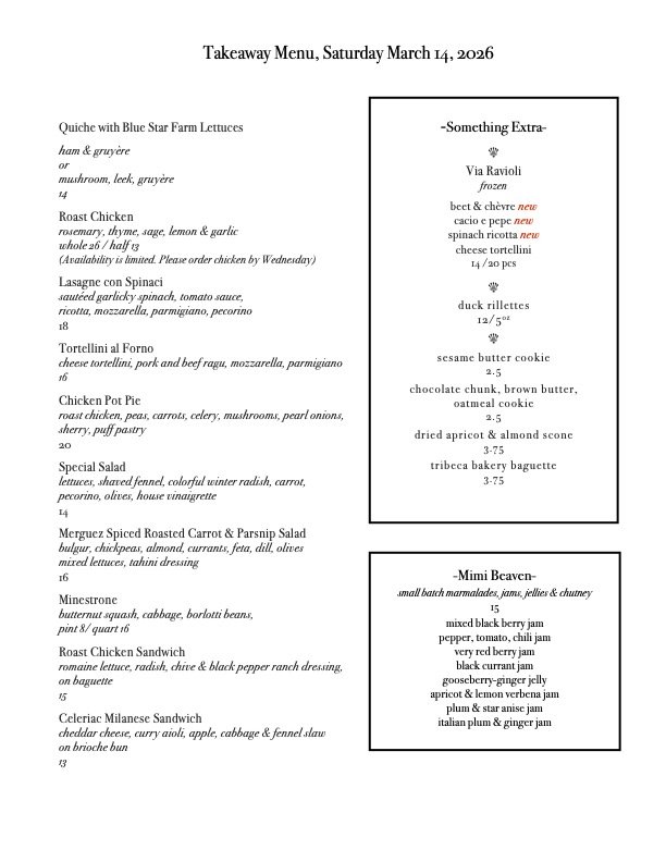 And don’t forget, Tribeca Bakery Baguette, and our own Duck Rillettes. Biscuits and Frittata by special order, mention to Michael when you call.